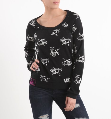 This sleek Fox sweater has cool Fox graphics throughout the body and sleeves. Theres even a bright pink Fox patch thrown on the bottom hem to show off some feminine style. The fabric has a super soft texture with a stretch for the perfect fit. Add this to your denim this season for a stylish and unique look! 24" length. 25" length. 16" along bottom hem. Measured from a size small. Model is 59" and wearing a size small..../ Premier Pullover Fleece - Black X Med Size / Sweater
